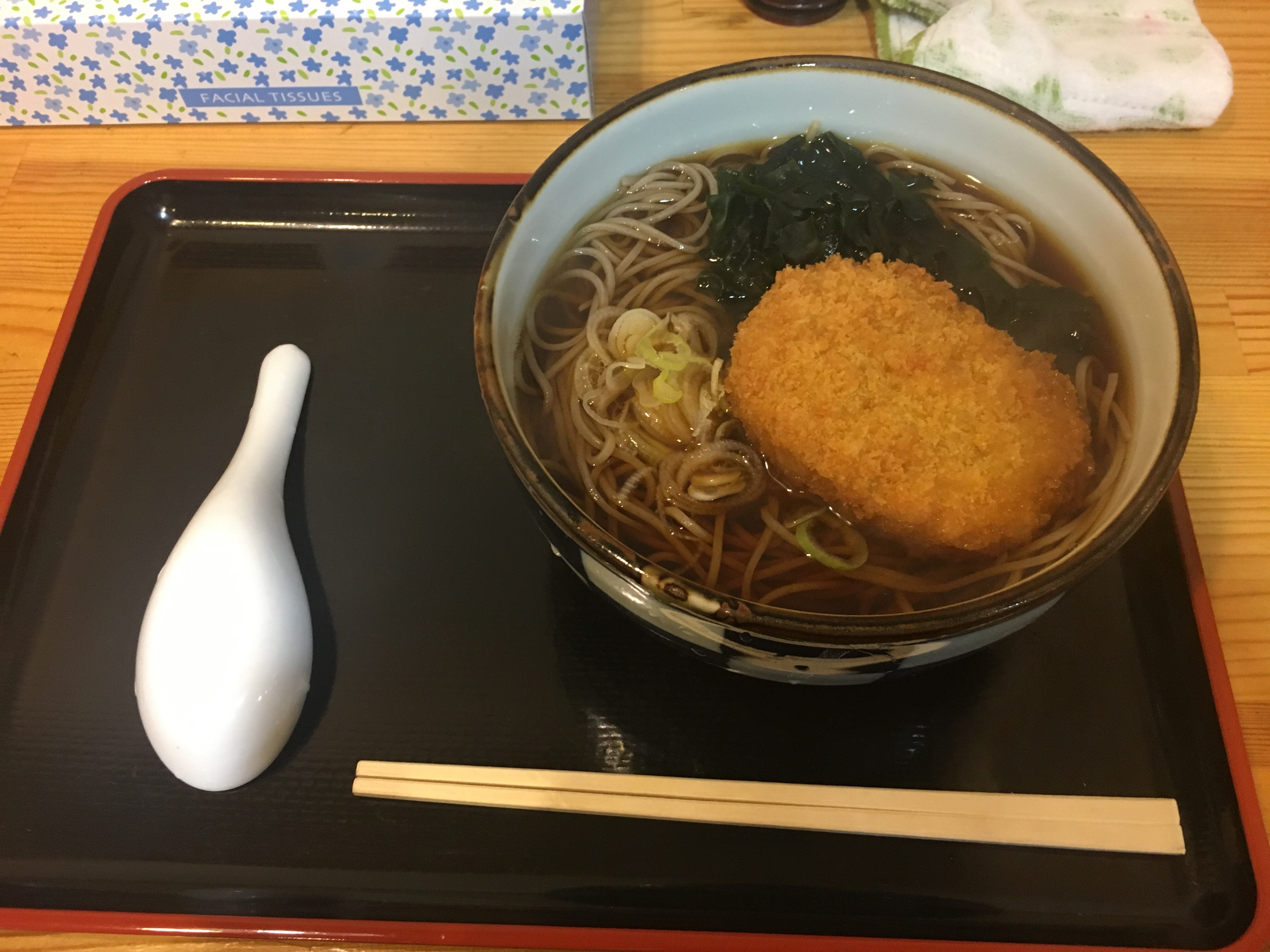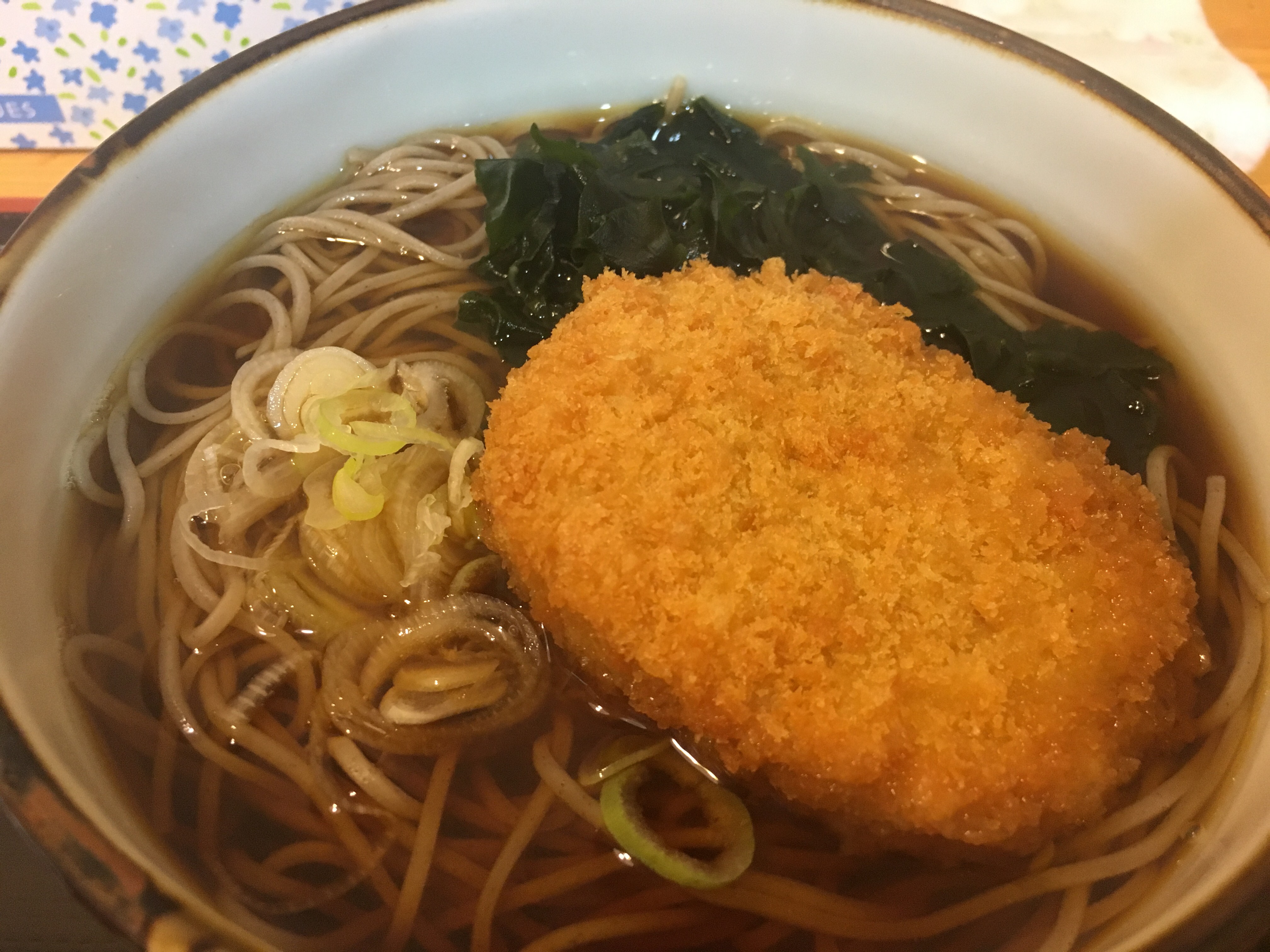 立ち食いと書かれていますが、座り食いです。このあたりのでは低価格なランチで、うれしい限り。何はともあれコロッケ蕎麦です。