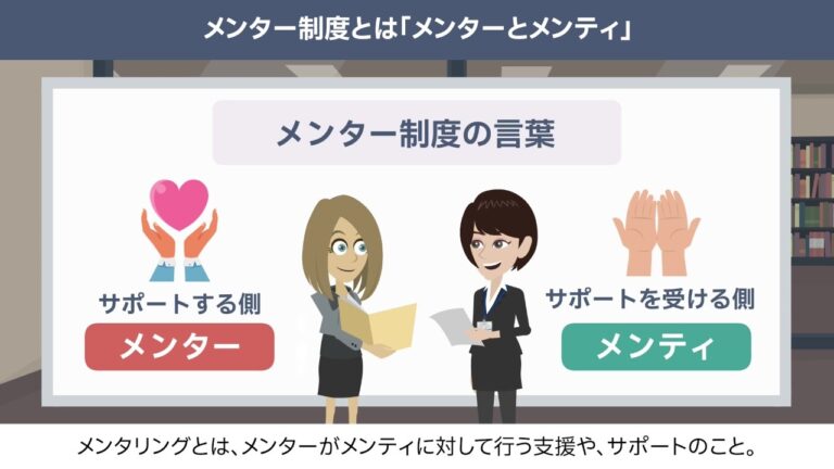 メンター制度とは、先輩社員が新入社員などに対して行う支援活動のことです。指導する先輩社員をメンター、...